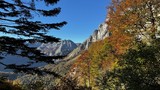 - Pas de sieste au programme, la descente sera longue, il reste des km à faire. Côté français, le soleil éclaire les arbres qui commencent leurs couleurs automnales.