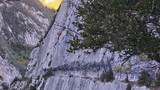 - Nous prenons le temps d'observer le massif. Au-dessus, la quantité de neige n'est pas grande, un petit passage est déjà purgé et il est encore tôt, le soleil ne tape pas sur les pentes. Nous nous engageons dans le passage assez encaissé.