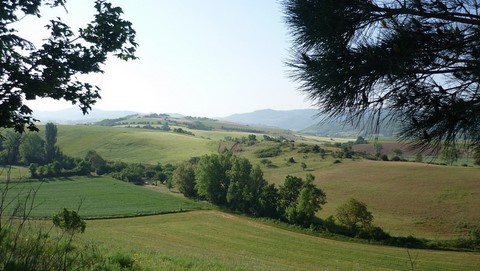 - C’est au pied de celle-ci que nous démarrons notre randonnée en sous-bois très appréciable. Une fois en haut nous apercevons au loin la chapelle Saint Jacques, le clocher de Camares et des collines tout autour de nous ainsi que leur verdure.